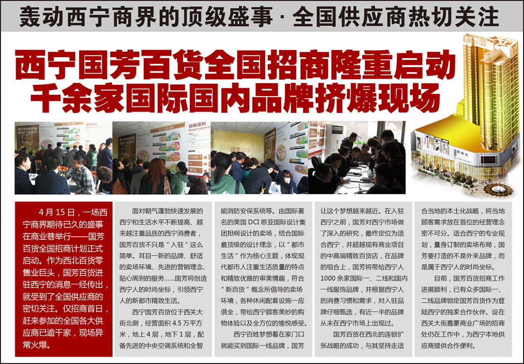 4月15日,一場西寧商界期待已久的盛事在商業巷舉行——國芳百貨全國招商計劃正式啟動。作為西北百貨零售業巨頭,國芳百貨進駐西寧的消息一經傳出,就受到了全國供應商的密切關注。僅招商首日,趕來參加的全國各大供應商已逾千家,現場異常火爆。