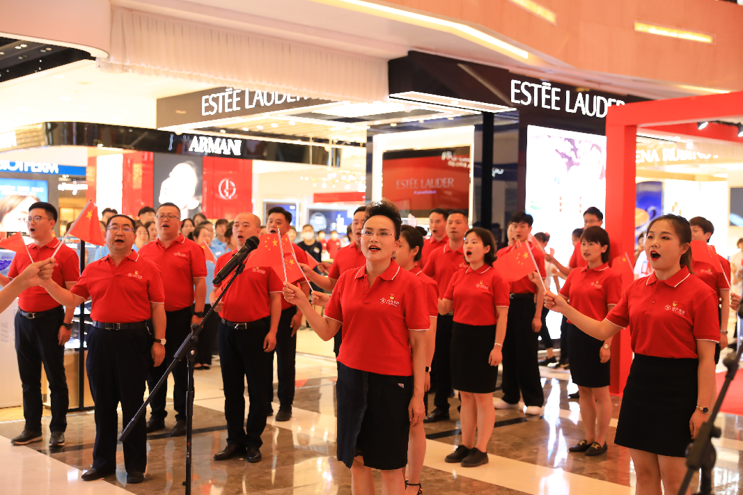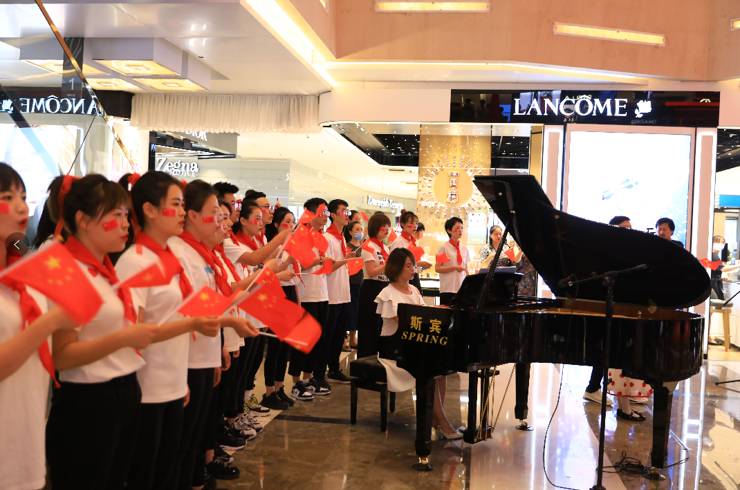 國芳百貨中廳,隨著鋼琴聲響起,活動在男、女領唱“歌唱我們親愛的祖國,從此走上繁榮富強”的歌聲中拉開了活動的序幕,30余名國芳集團黨員及員工代表緩緩向主舞臺走來,大家手持國旗,組合成“100”字樣,神采奕奕,高聲齊唱。與此同時,現場的圍觀顧客也紛紛加入到隊伍當中,為演出錦上添花。