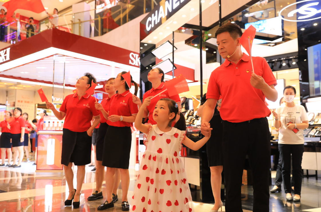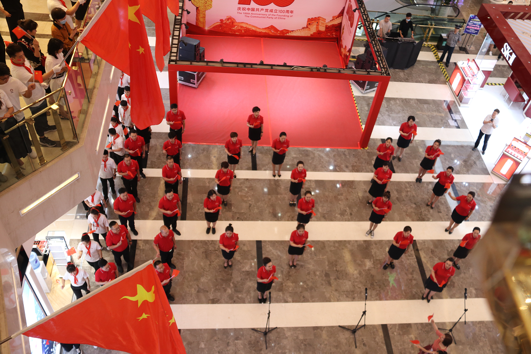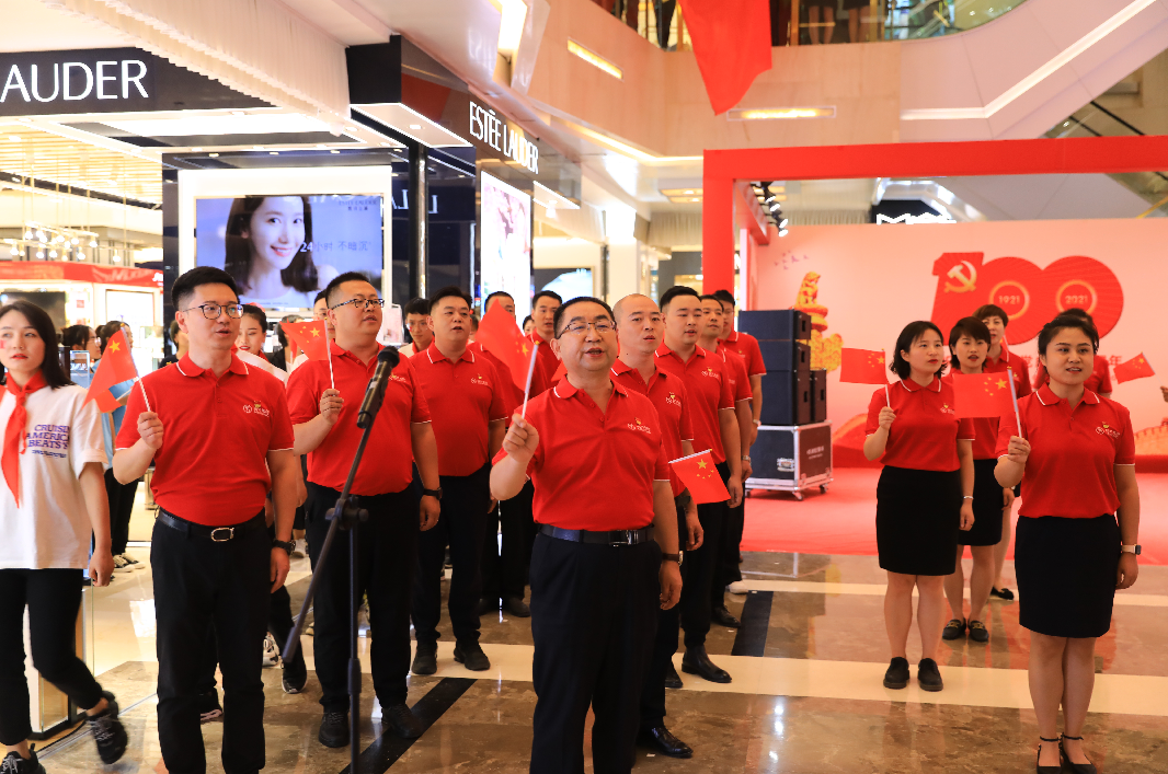 下午14時,國芳集團慶祝中國共產黨成立100周年紅歌快閃活動在蘭州國芳百貨廣場店一樓中廳隆重舉行。國芳集團全體黨員及員工代表參與其中,大家用歌聲表達對黨的無限忠誠和美好祝福。